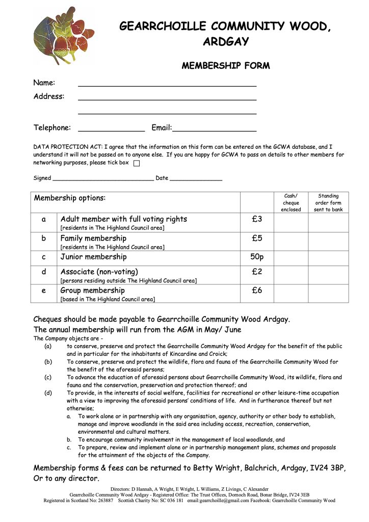 Gearrchoille Community Wood Ardgay is a company limited by guarantee, and a registered charity. It was formed to take ownership of the wood.